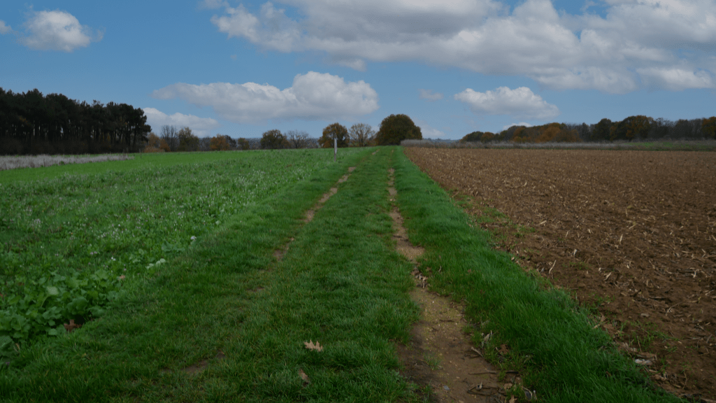 Lorsque vous vous trouvez au niveau du parking, vous devez monter la route et prendre la première à gauche. Celle-ci vous permet de vous rendre dans un petit chemin entre les champs.