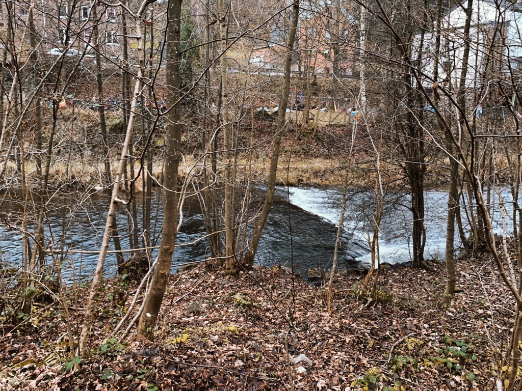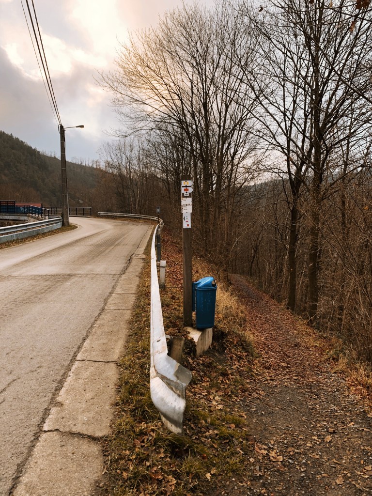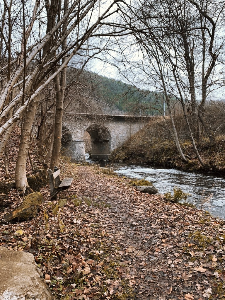 Pour commencer la promenade, montez la rue. Ensuite, trouvez sur votre droite, jute avant le pont, un petit chemin indiqué par le rectangle rouge.