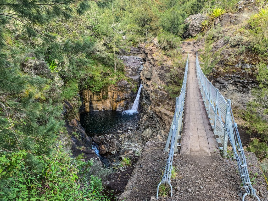 C’est reparti pour la dernière randonnée de la journée en direction de La Nouvelle. Deux chemins sont possibles dont une en passant par la passerelle. Des montées et des descendes au rendez-vous de cette dernière randonnée. Le moment tant attendu de cette dernière étape, l’arrivée à la passerelle. Quel endroit magnifique, rivière, petite cascade et passerelle, rien de mieux !