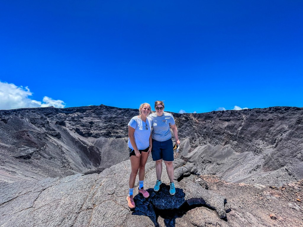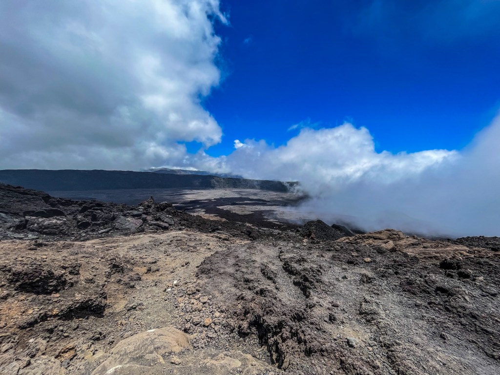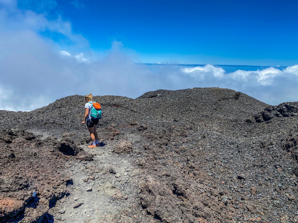 Avant d’arriver au sommet, nous nous sommes trouvées dans les nuages et les degrés ont dégringolé d’un coup ! Nous avions peur d’arriver au dessus et de ne rien voir. Il fallait juste continuer la randonnée pour connaître la réponse. Incroyable, juste avant d’arriver au dessus, plus aucun nuage grand ciel bleu. Quelle splendeur de pouvoir observer ce volcan de si près !
