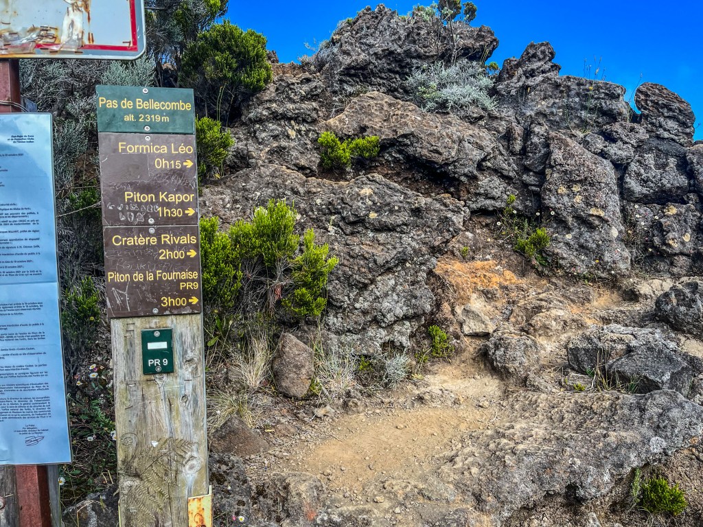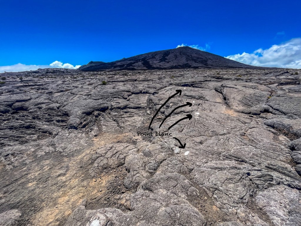 En descendant les escaliers, on observe assez vite des points blancs. Ces points blancs sont à suivre, ils vous amèneront jusqu’au point final. Dans l’enclos, il y a différents points à observer, tous très bien indiqués. Pour se rendre jusqu’au dessus du volcan, il faut suivre les plaques Piton de la Fournaise, bien indiquées ! Le temps moyen estimé pour se rendre au dessus du volcan, en dessous des escaliers, est de 2h45.