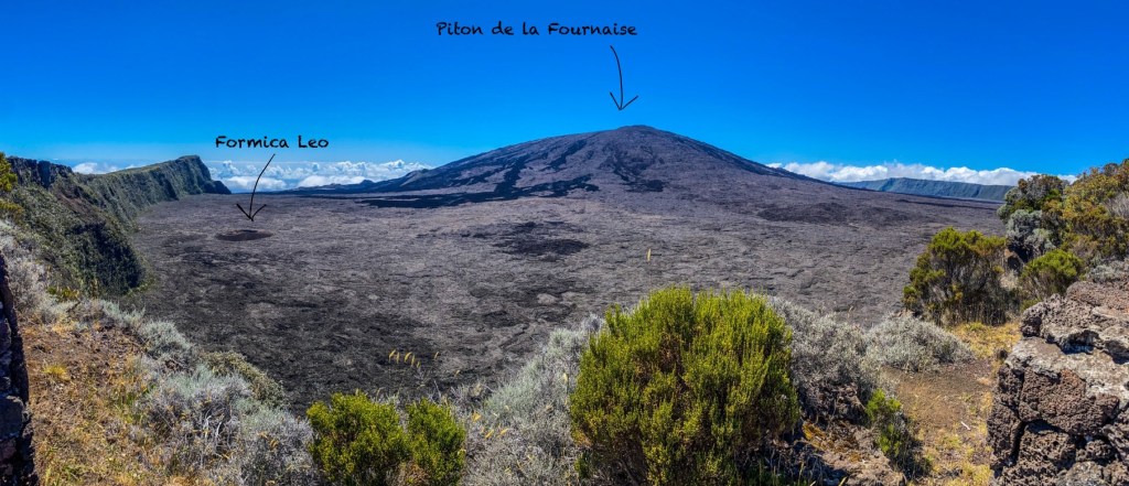 L’enclos est très impressionnant, il est surplombé par des parois hautes de cent à quatre cents mètres. Ensuite, le Formica Leo est un petit cône volcanique du Piton de la Fournaise d’une hauteur d’une vingtaine de mètres. Il s’est formé lors d’une éruption volcanique en 1753. Pour finir, au loin on aperçoit le Piton de la Fournaise.
